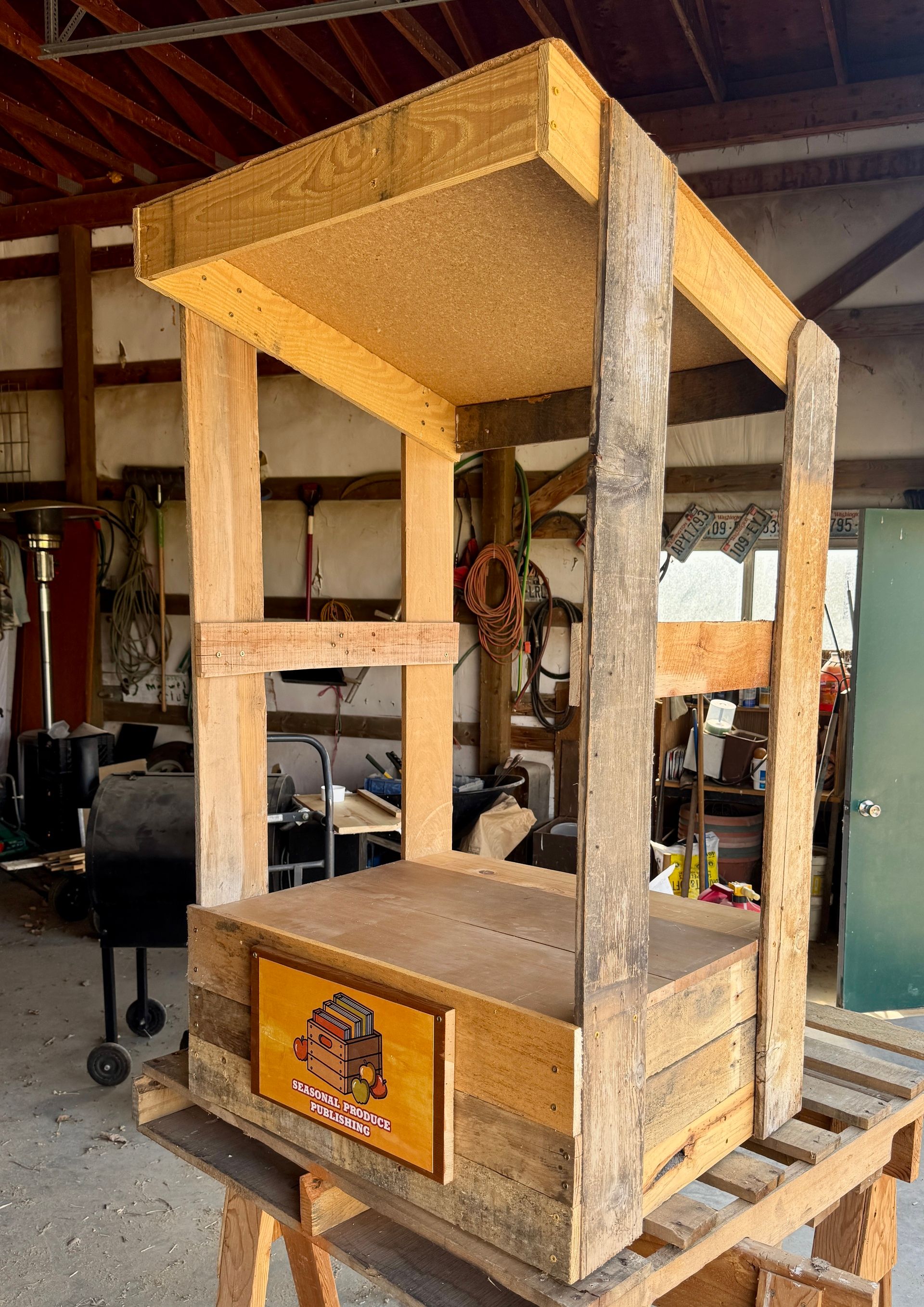 Look for the produce stand! With a lot of assistance from my dad, last month I built a signature display that looks like a produce stand for my brand Seasonal Produce Publishing. I’ve been looking for ways to stand out from the standard convention tables and this beautiful display made of recycled wood is an exciting way to engage customers.